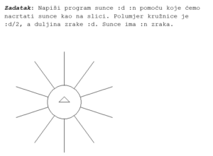 - osnovne naredbe za kretanje kornjače (naprijed, nazad, lijevo, desno, podizanje i spuštanje olovke, brisanje ekrana, vraćanje na početak)