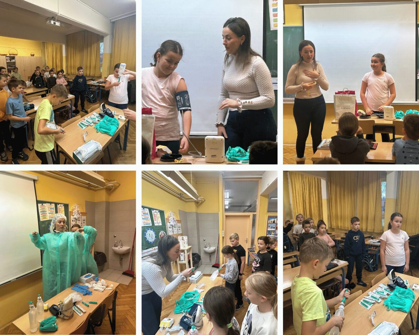 Mama Curic je madicinska sestra i primalja pa nam je na zanimljiv nacin prezentirala koje su njene duznosti. Djeca su vjezbala vaditi fiziolosku otopinu, mjerili su tlak, pokazala im je odjecu u kojoj radi te neke instrumente s kojima se sluzi. Ucenici su pozorno slusali i sudjelovali.